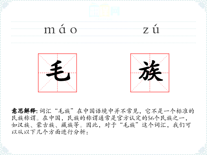 词汇“毛族”在语境中并不常见,它不是一个标准的民族称谓。在,民族的称谓通常是官方认定的5*个民族之一,如、蒙古族、等。因此,对于“毛族”这个词汇,我们可以从以下几个方面进行分析: