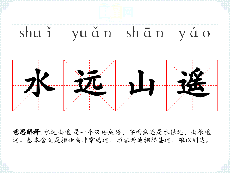 水远山遥 是一个汉语成语,字面意思是水很远,山很遥远。基本含义是指距离非常遥远,形容两地相隔甚远,难以到达。