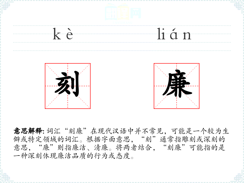 - 理解:“刻廉”是一个强调廉洁行为严格性和深刻性的词汇,虽然在日常使用中不常见,但在特定领域和文化背景下具有重要意义。