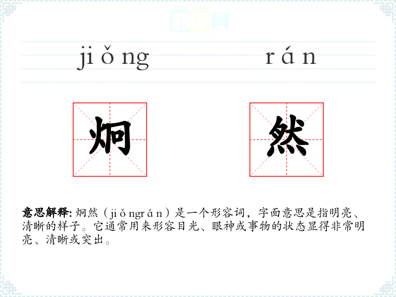 炯然(jiǒngrán)是一个形容词,字面意思是指明亮、清晰的样子。它通常用来形容目光、眼神或事物的状态显得非常明亮、清晰或突出。
