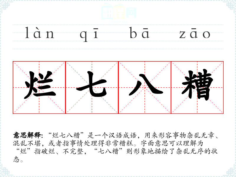 “烂七八糟”这个成语的词源并不十分明确,但它反映了汉语中常用数字和量词来形象化描述状态的特点。随着时间的推移,这个成语的使用范围和语境有所扩展,但其核心意义保持不变。