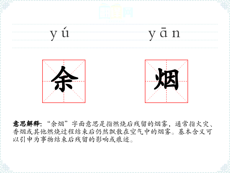 “余烟”一词由“余”和“烟”组成,“余”表示剩余、残留,“烟”表示烟雾。在古代文献中,“余烟”常用来形容战争或火灾后的景象,随着时间的推移,其含义逐渐丰富,引申为残留的影响或痕迹。
