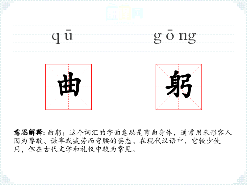 曲躬:这个词汇的字面意思是弯曲身体,通常用来形容人因为尊敬、谦卑或疲劳而弯腰的姿态。在现代汉语中,它较少使用,但在古代文学和礼仪中较为常见。
