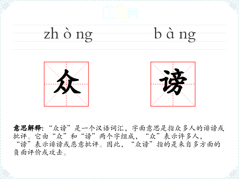 “众谤”是一个汉语词汇,字面意思是指众多人的诽谤或批评。它由“众”和“谤”两个字组成,“众”表示许多人,“谤”表示诽谤或恶意批评。因此,“众谤”指的是来自多方面的负面评价或攻击。