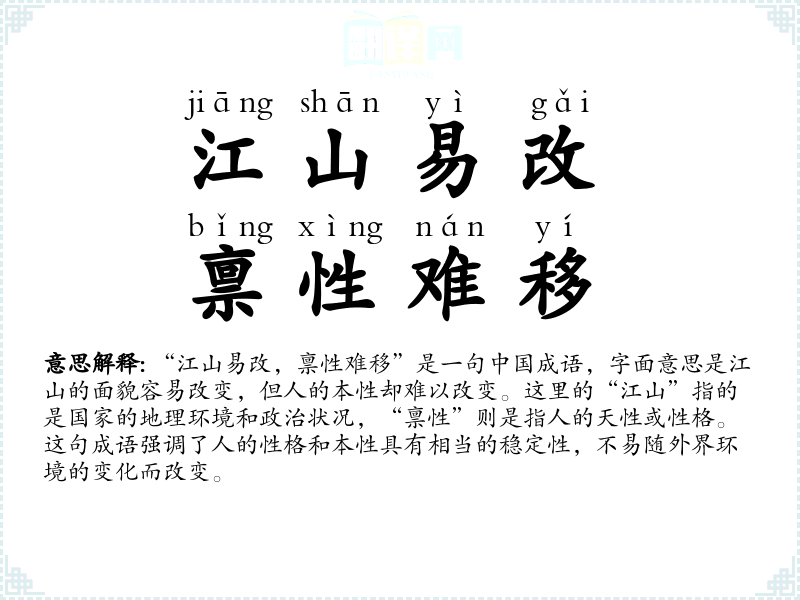 “江山易改,禀性难移”是一句**成语,字面意思是江山的面貌容易改变,但人的本性却难以改变。这里的“江山”指的是国家的地理环境和政治状况,“禀性”则是指人的天性或性格。这句成语强调了人的性格和本性具有相当的稳定性,不易随外界环境的变化而改变。