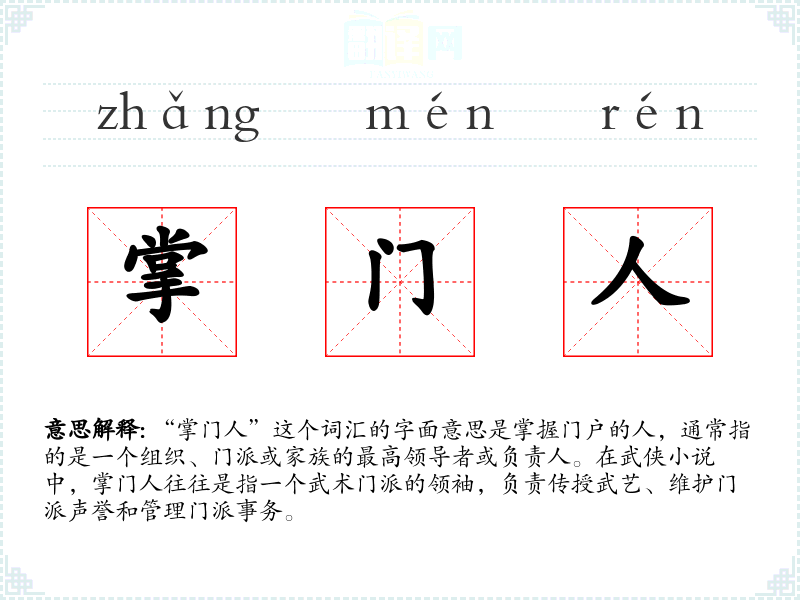 “掌门人”这个词汇的字面意思是掌握门户的人,通常指的是一个组织、门派或家族的最高领导者或负责人。在武侠小说中,掌门人往往是指一个武术门派的领袖,负责传授武艺、维护门派声誉和管理门派事务。