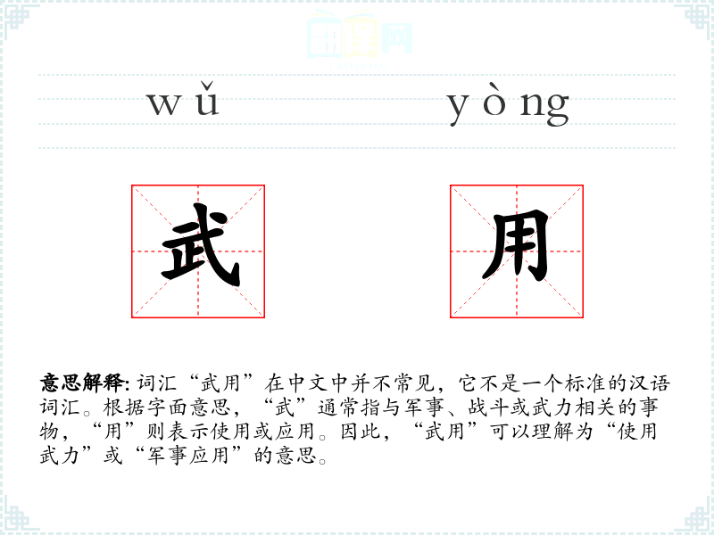 词汇“武用”在中文中并不常见,它不是一个标准的汉语词汇。根据字面意思,“武”通常指与军事、战斗或武力相关的事物,“用”则表示使用或应用。因此,“武用”可以理解为“使用武力”或“军事应用”的意思。