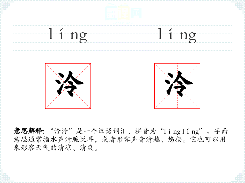 “泠泠”是一个汉语词汇,拼音为“líng líng”。字面意思通常指水声清脆悦耳,或者形容声音清越、悠扬。它也可以用来形容天气的清凉、清爽。