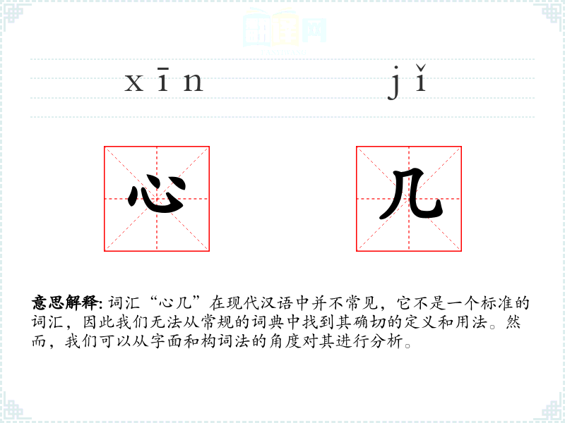 结合这两个字,我们可以推测“心几”可能指的是与心相关的不确定数量或程度,或者是在某种情境下对心的考量。