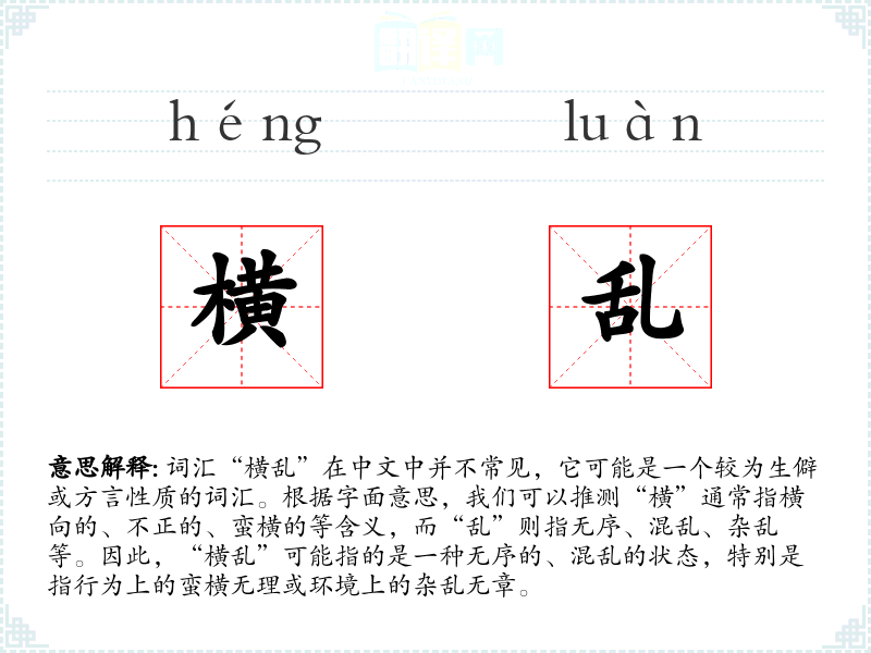 词汇“横乱”在中文中并不常见,它可能是一个较为生僻或方言性质的词汇。根据字面意思,我们可以推测“横”通常指横向的、不正的、蛮横的等含义,而“乱”则指无序、混乱、杂乱等。因此,“横乱”可能指的是一种无序的、混乱的状态,特别是指行为上的蛮横无理或环境上的杂乱无章。