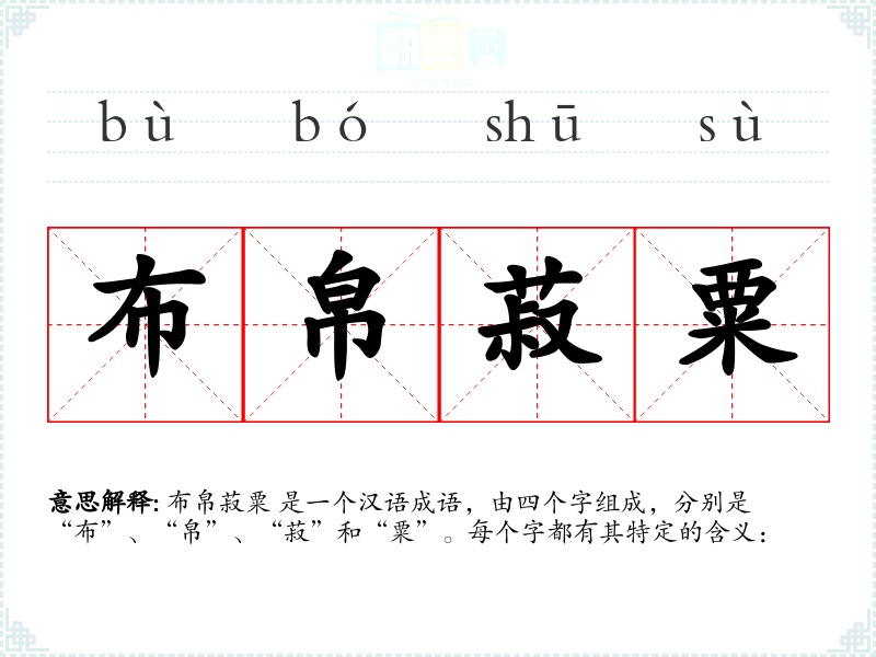 布帛菽粟 是一个汉语成语,由四个字组成,分别是“布”、“帛”、“菽”和“粟”。每个字都有其特定的含义: