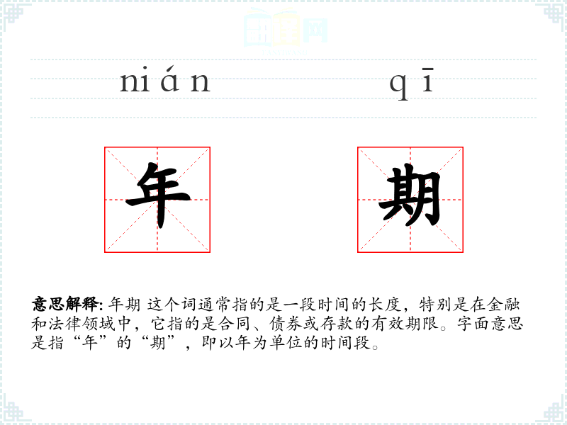 “年期”这个词由“年”和“期”两个字组成,其中“年”指的是时间单位,“期”指的是时间段。这个词在中文中历史悠久,主要在金融和法律领域中使用,近年来随着金融产品的多样化,其使用频率有所增加。