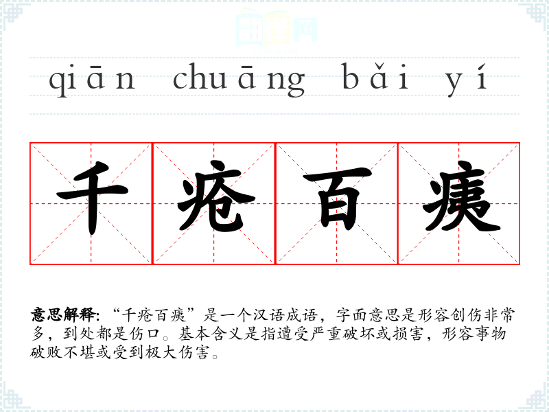 “千疮百痍”是一个汉语成语,字面意思是形容创伤非常多,到处都是伤口。基本含义是指遭受严重破坏或损害,形容事物破败不堪或受到极大伤害。
