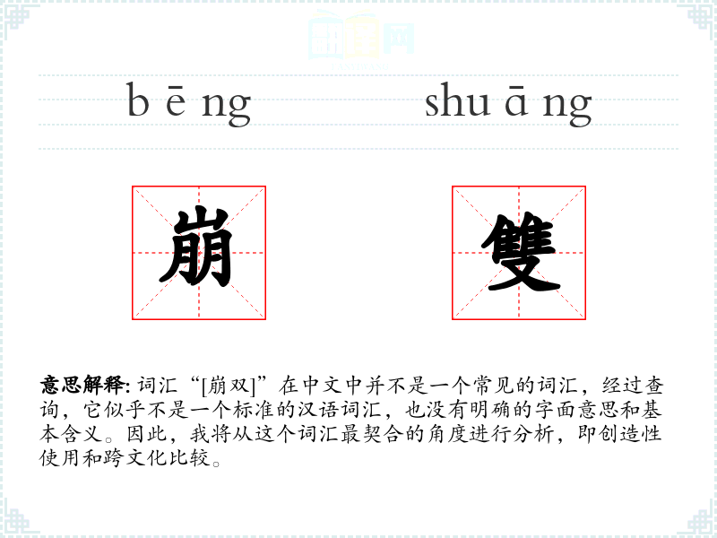 词汇“[崩双]”在中文中并不是一个常见的词汇,经过查询,它似乎不是一个标准的汉语词汇,也没有明确的字面意思和基本含义。因此,我将从这个词汇最契合的角度进行分析,即创造性使用和跨文化比较。