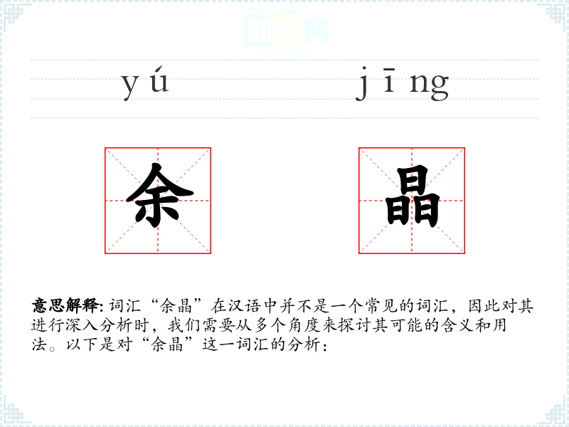词汇“余晶”在汉语中并不是一个常见的词汇,因此对其进行深入分析时,我们需要从多个角度来探讨其可能的含义和用法。以下是对“余晶”这一词汇的分析: