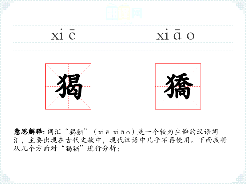 词汇“猲狾”(xiē xiāo)是一个较为生僻的汉语词汇,主要出现在古代文献中,现代汉语中几乎不再使用。下面我将从几个方面对“猲狾”进行分析: