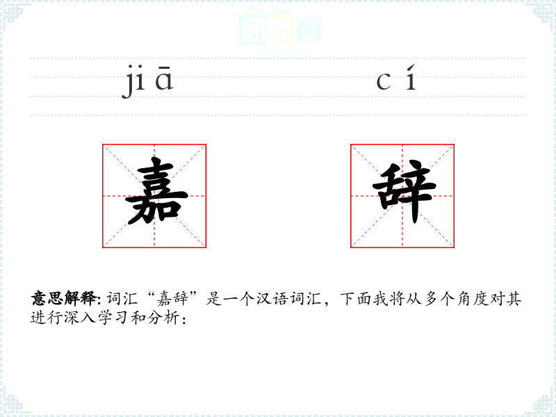 词汇“嘉辞”是一个汉语词汇,下面我将从多个角度对其进行深入学*和分析:
