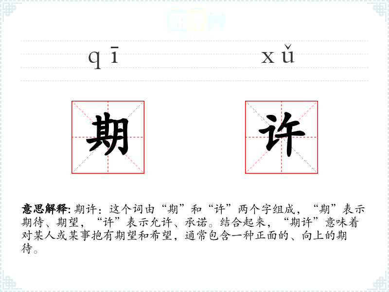 期许:这个词由“期”和“许”两个字组成,“期”表示期待、期望,“许”表示允许、承诺。结合起来,“期许”意味着对某人或某事抱有期望和希望,通常包含一种正面的、向上的期待。