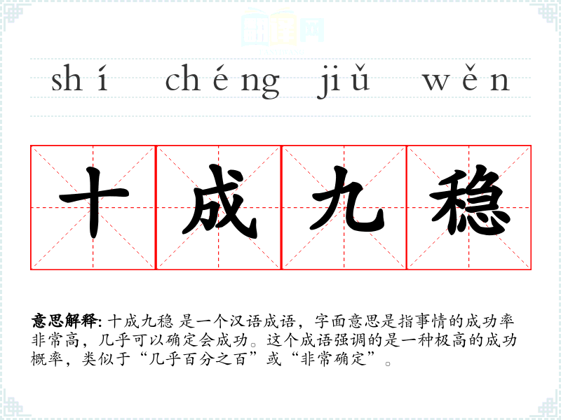 十成九稳 是一个汉语成语,字面意思是指事情的成功率非常高,几乎可以确定会成功。这个成语强调的是一种极高的成功概率,类似于“几乎百分之百”或“非常确定”。