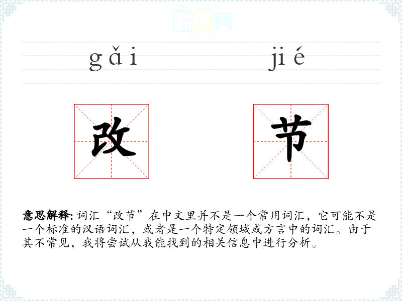 词汇“改节”在中文里并不是一个常用词汇,它可能不是一个标准的汉语词汇,或者是一个特定领域或方言中的词汇。由于其不常见,我将尝试从我能找到的相关信息中进行分析。