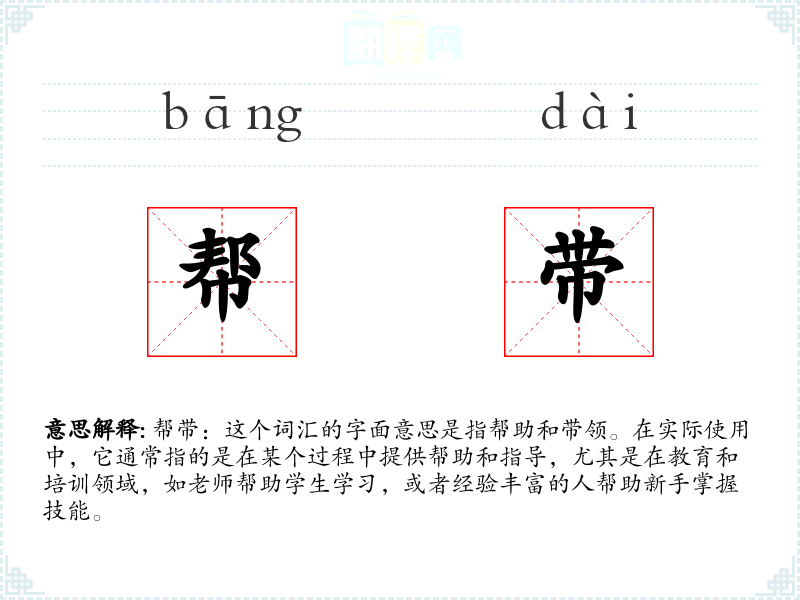 帮带这个词源于汉语,由“帮”和“带”两个字组成,分别表示帮助和带领。在现代汉语中,这个词的使用逐渐扩展到各种需要帮助和指导的场合。