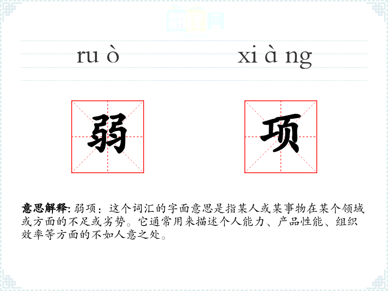 在英语中,“weakness”对应于“弱项”。在不同的文化中,人们对待弱项的态度可能有所不同,但普遍都认同识别和改进弱项的重要性。