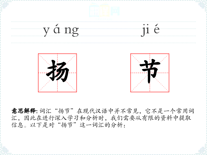 词汇“扬节”在现代汉语中并不常见,它不是一个常用词汇,因此在进行深入学*和分析时,我们需要从有限的资料中提取信息。以下是对“扬节”这一词汇的分析: