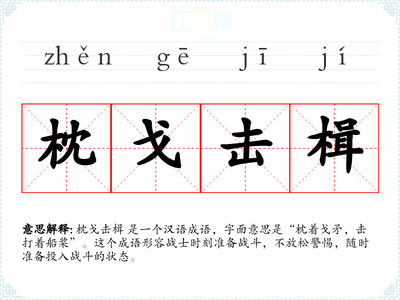 枕戈击楫 是一个汉语成语,字面意思是“枕着戈矛,击打着船桨”。这个成语形容战士时刻准备战斗,不放松警惕,随时准备投入战斗的状态。