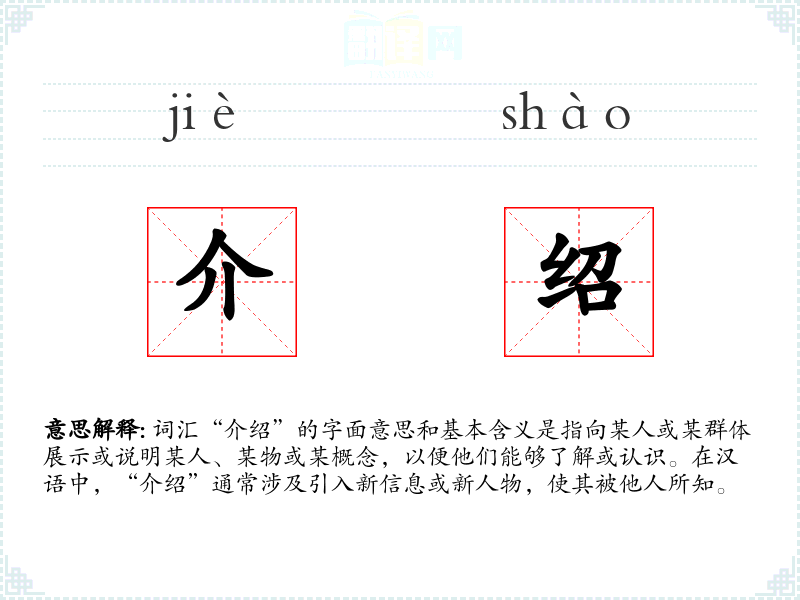 词汇“介绍”的字面意思和基本含义是指向某人或某群体展示或说明某人、某物或某概念,以便他们能够了解或认识。在汉语中,“介绍”通常涉及引入新信息或新人物,使其被他人所知。