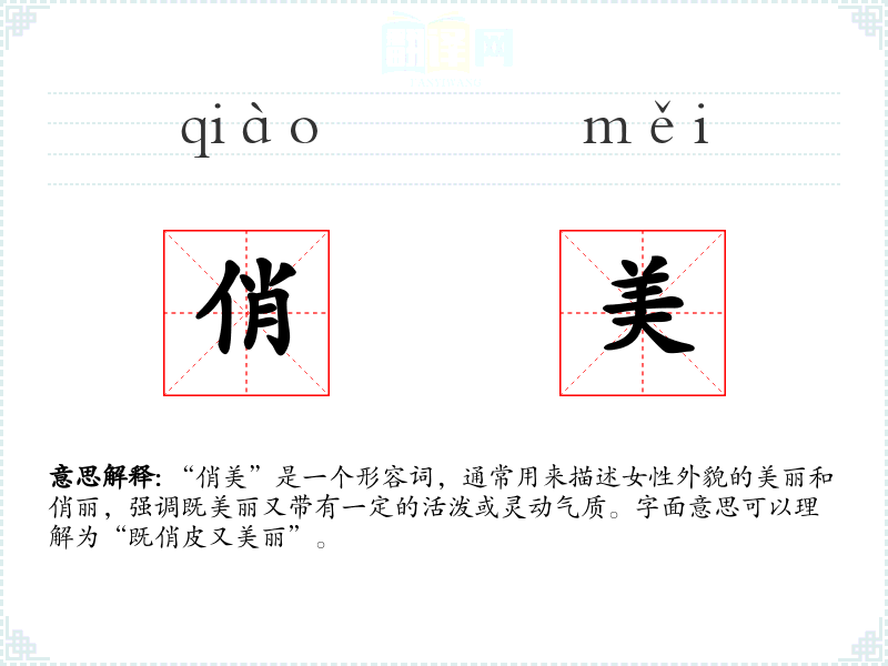 “俏美”是一个形容词,通常用来描述女性外貌的美丽和俏丽,强调既美丽又带有一定的活泼或灵动气质。字面意思可以理解为“既俏皮又美丽”。