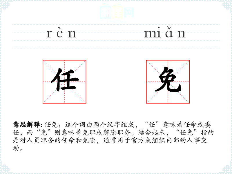 任免:这个词由两个汉字组成,“任”意味着任命或委任,而“免”则意味着免职或解除职务。结合起来,“任免”指的是对人员职务的任命和免除,通常用于官方或组织内部的人事变动。