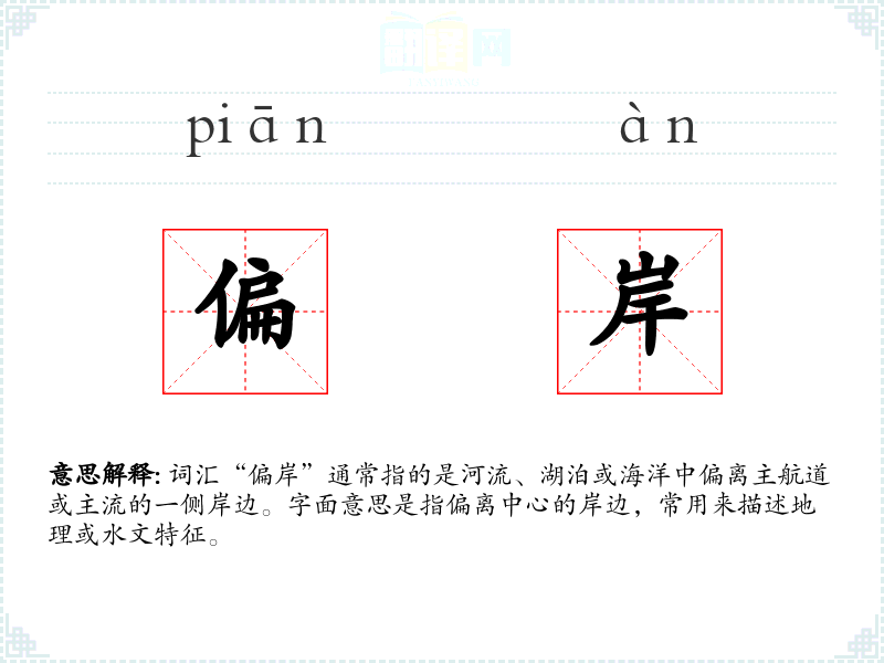 词汇“偏岸”通常指的是河流、湖泊或海洋中偏离主航道或主流的一侧岸边。字面意思是指偏离中心的岸边,常用来描述地理或水文特征。