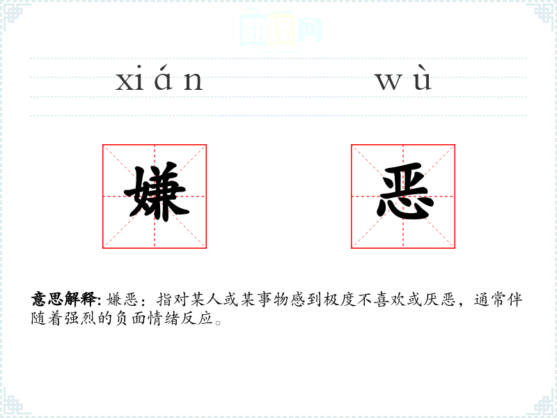 - 词源:嫌恶一词源于古代汉语,由“嫌”和“恶”两个字组成,分别表示“不满意”和“讨厌”。