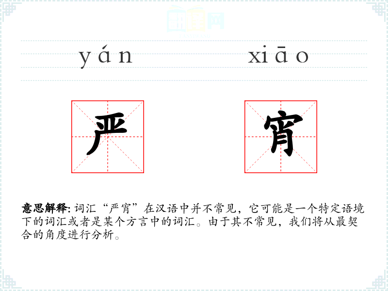 词汇“严宵”在汉语中并不常见,它可能是一个特定语境下的词汇或者是某个方言中的词汇。由于其不常见,我们将从最契合的角度进行分析。