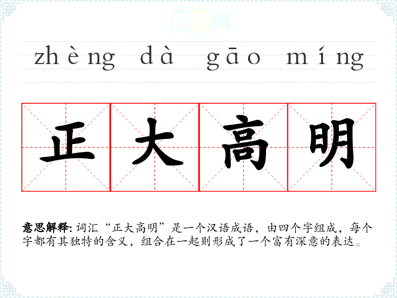 词汇“正大高明”是一个汉语成语,由四个字组成,每个字都有其独特的含义,组合在一起则形成了一个富有深意的表达。
