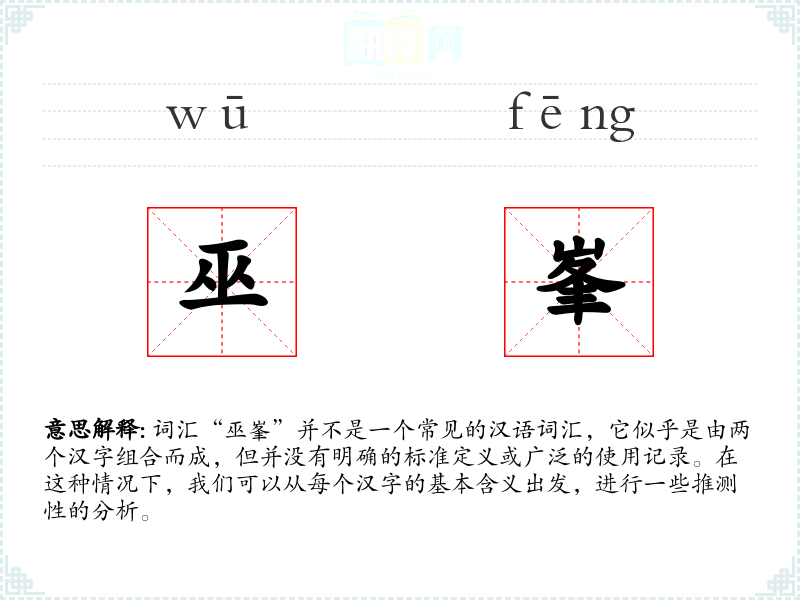 结合这两个字,“巫峯”可能指的是一个与巫术或神秘活动相关的山峰,或者是一个具有神秘色彩的地理名称。