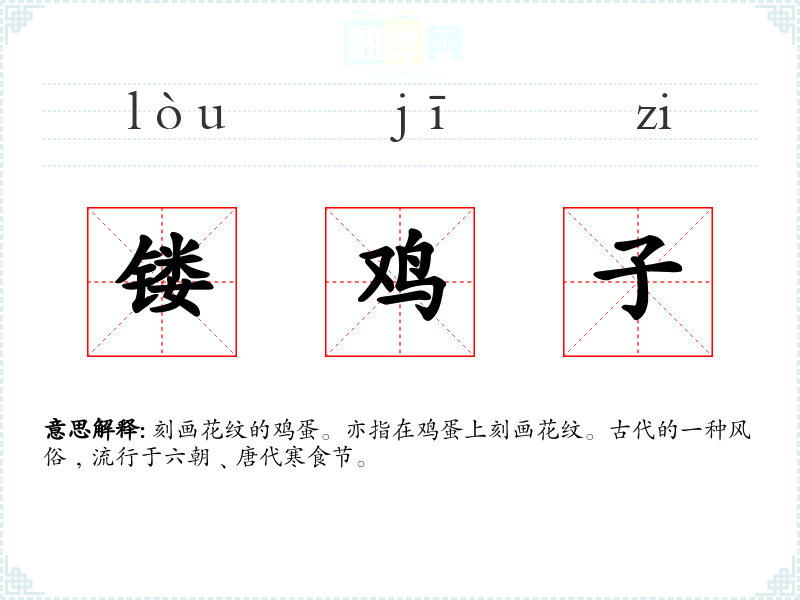 刻画花纹的鸡蛋。亦指在鸡蛋上刻画花纹。古代的一种风俗﹐流行于六朝﹑唐代寒食节。