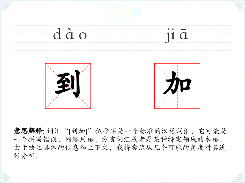 词汇“[到加]”似乎不是一个标准的汉语词汇,它可能是一个拼写错误、网络用语、方言词汇或者是某种特定领域的术语。由于缺乏具体的信息和上下文,我将尝试从几个可能的角度对其进行分析。