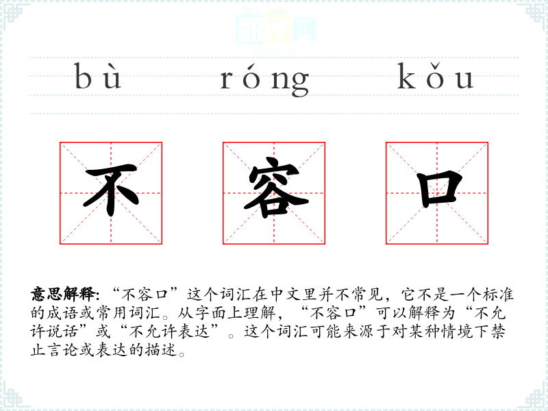“不容口”这个词汇在中文里并不常见,它不是一个标准的成语或常用词汇。从字面上理解,“不容口”可以解释为“不允许说话”或“不允许表达”。这个词汇可能来源于对某种情境下禁止言论或表达的描述。