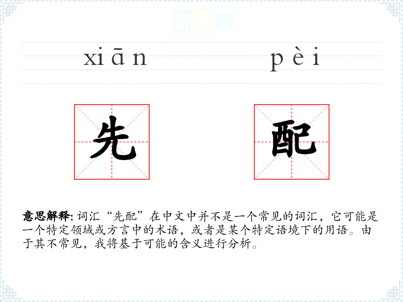 词汇“先配”在中文中并不是一个常见的词汇,它可能是一个特定领域或方言中的术语,或者是某个特定语境下的用语。由于其不常见,我将基于可能的含义进行分析。