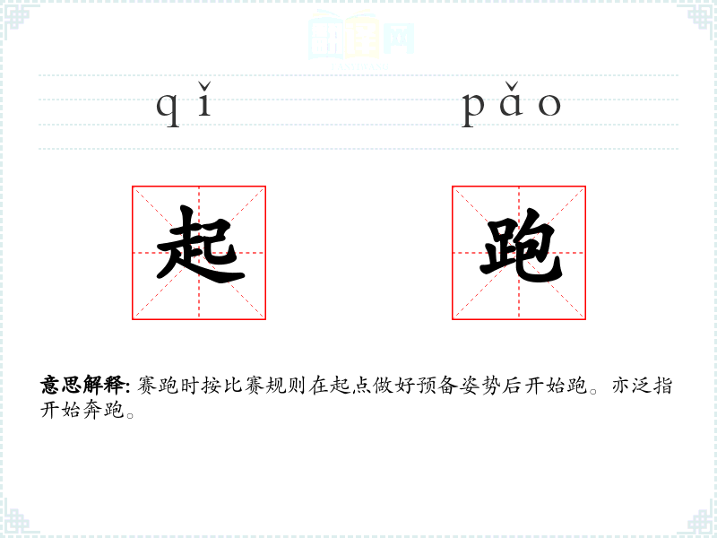 赛跑时按比赛规则在起点做好预备姿势后开始跑。亦泛指开始奔跑。