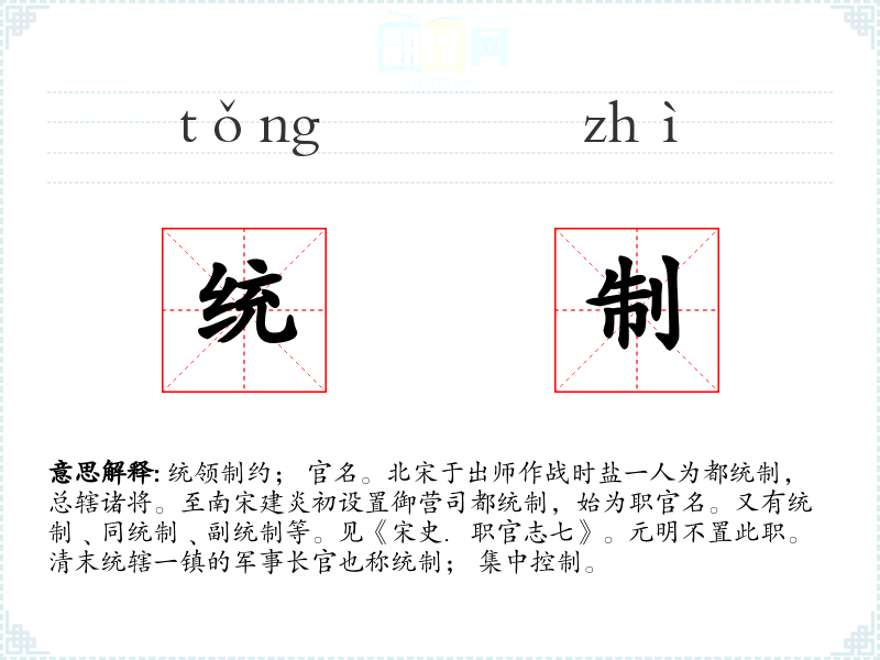 1.统领制约; 官名。北宋于出师作战时盐一人为都统制,总辖诸将。至南宋建炎初设置御营司都统制,始为职官名。又有统制﹑同统制﹑副统制等。见《宋史.职官志七》。元明不置此职。清末统辖一镇的军事长官也称统制; 集中控制。