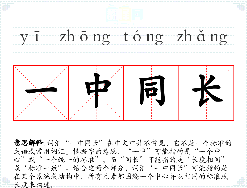 词汇“一中同长”在中文中并不常见,它不是一个标准的成语或常用词汇。根据字面意思,“一中”可能指的是“一个中心”或“一个统一的标准”,而“同长”可能指的是“长度相同”或“标准一致”。结合这两个部分,词汇“一中同长”可能指的是在某个系统或结构中,所有元素都围绕一个中心并以相同的标准或长度来构建。