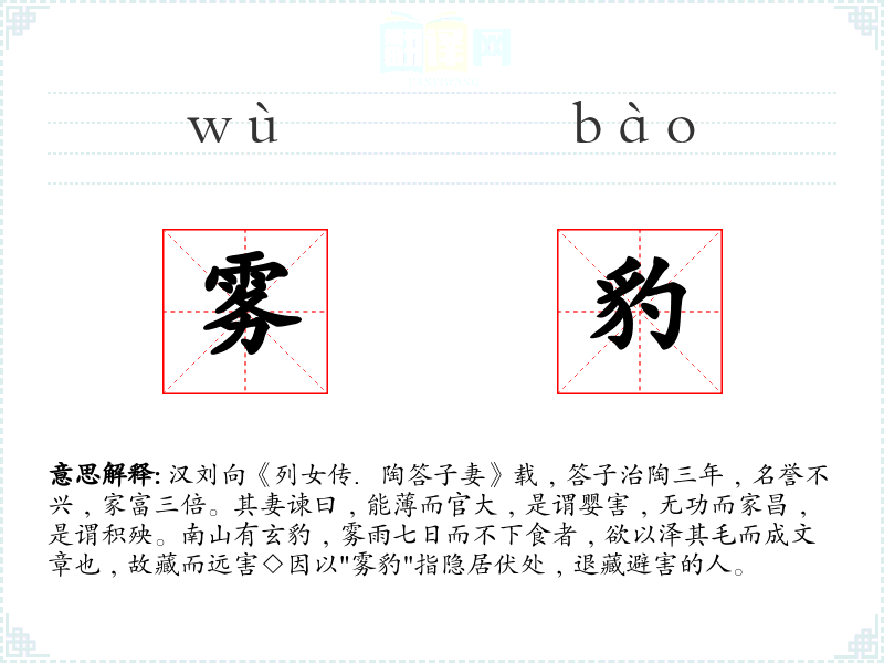 1.汉刘向《列女传.陶答子妻》载﹐答子治陶三年﹐名誉不兴﹐家富三倍。其妻谏曰﹐能薄而官大﹐是谓婴害﹐无功而家昌﹐是谓积殃。南山有玄豹﹐雾雨七日而不下食者﹐欲以泽其毛而成文章也﹐故藏而远害◇因以"雾豹"指隐居伏处﹐退藏避害的人。