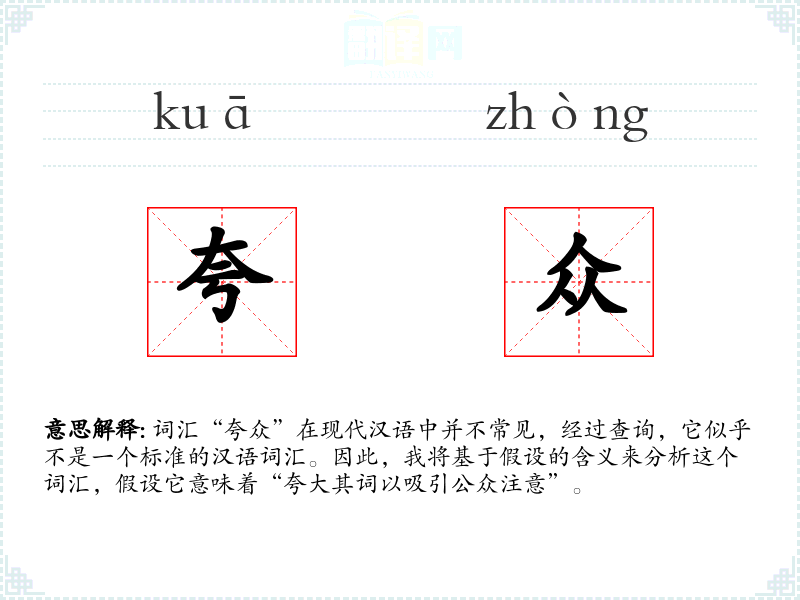 “夸众”可以理解为通过夸大事实或表现来吸引公众的注意。这个词汇强调了夸大的行为是为了达到公众关注的目的。