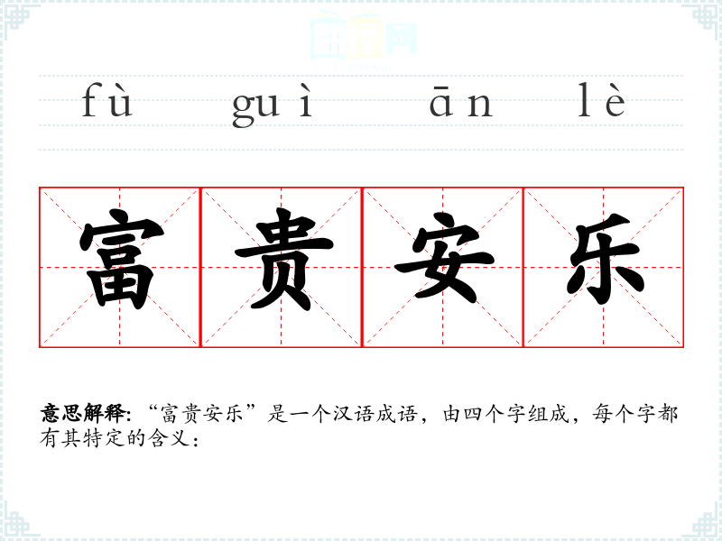 “富贵安乐”是一个汉语成语,由四个字组成,每个字都有其特定的含义: