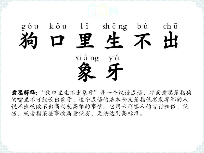 “狗口里生不出象牙”是一个汉语成语,字面意思是指狗的嘴里不可能长出象牙。这个成语的基本含义是指低劣或卑鄙的人说不出或做不出高尚或高雅的事情。它用来形容人的言行粗俗、低劣,或者指某些事物质量低劣,无法达到高标准。