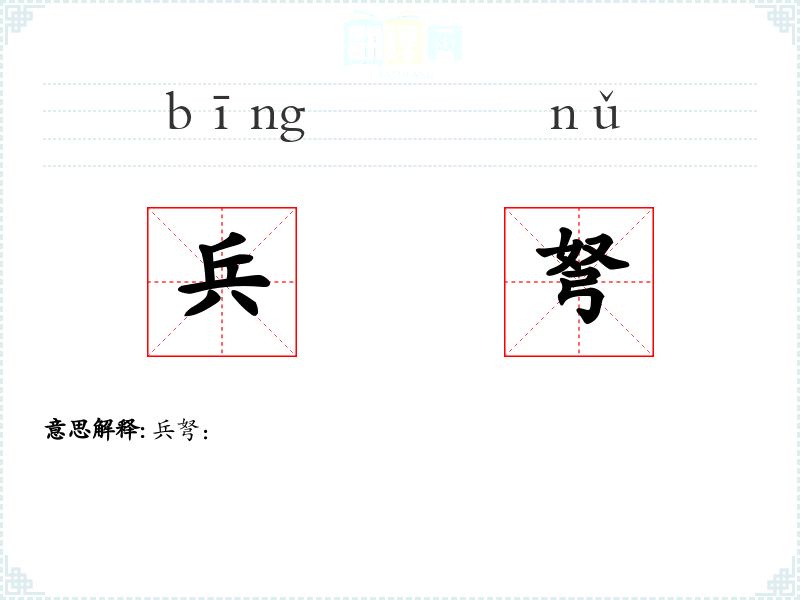 - 字面意思:兵,指兵器或士兵;弩,是一种古代的弓箭武器,利用机械装置发射箭矢。