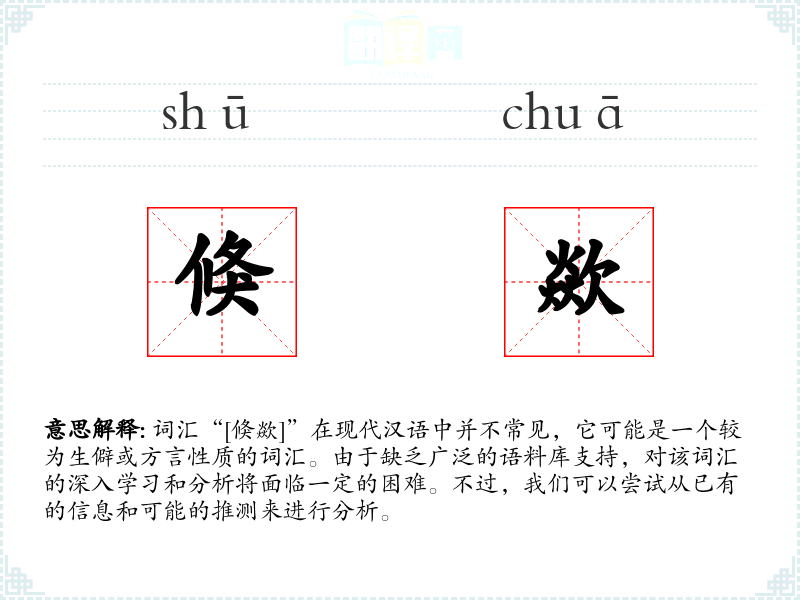 词汇“[倏歘]”在现代汉语中并不常见,它可能是一个较为生僻或方言性质的词汇。由于缺乏广泛的语料库支持,对该词汇的深入学习和分析将面临一定的困难。不过,我们可以尝试从已有的信息和可能的推测来进行分析。