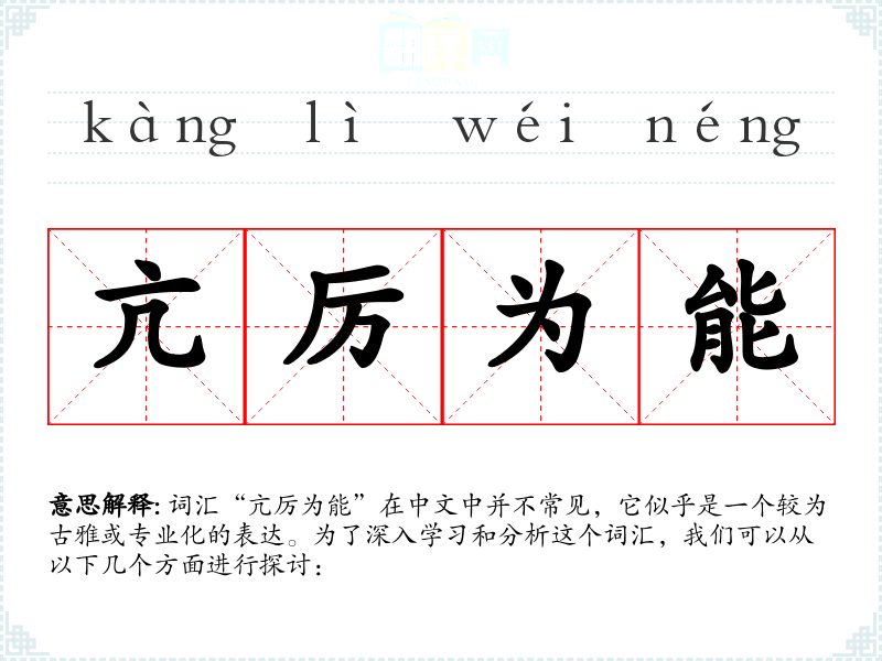 词汇“亢厉为能”在中文中并不常见,它似乎是一个较为古雅或专业化的表达。为了深入学*和分析这个词汇,我们可以从以下几个方面进行探讨: